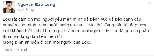 Trước đó anh đã gửi lời cảm ơn trên trang cá nhân với những khán giả luôn ủng hộ mình "Loki rất cám ơn mọi người yêu mến mình đã bênh vực và bên cạnh cầu nguyện cho mình trong suốt thời gian qua. Mọi thứ đang dần tốt đẹp hơn... Loki không biết nói gì hơn ngoài cám ơn mọi người. Mẹ tớ đã qua ca phẫu thuật và đang dần tiến triển tốt".