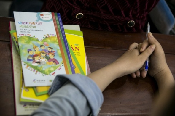 Những cuốn sách tiếng Hàn của một cô dâu Việt. Phần lớn những cuộc hôn nhân xuyên quốc gia đều thông qua môi giới. Chú rể người Hàn Quốc bay sang Việt Nam, gặp cô dâu mà bên trung gian giới thiệu. Nếu mọi việc thuận lợi, chỉ trong gần một ngày sau họ trở thành vợ chồng. Tuy nhiên, những bất đồng về văn hóa, ngôn ngữ khiến nhiều cuộc hôn nhân kết thúc nhanh chóng như lúc chúng bắt đầu. Chính phủ Hàn Quốc muốn giảm tỷ lệ ly hôn nên đầu tư tiền để mở các lớp đào tạo đặc biệt cho cô dâu Việt chuẩn bị xuất giá. |