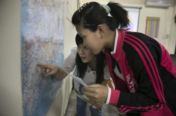 Giáo viên Trần Phương Anh chỉ nơi cô dâu Đỗ Thị Trúc Linh sẽ tới trên tấm bản đồ Hàn Quốc. Cô thôn nữ 28 tuổi hoàn toàn chưa biết gì về xứ kim chi. Việc theo học lớp bổ trợ sẽ giúp cô rất nhiều trong việc hòa nhập với cuộc sống nơi xứ người. |