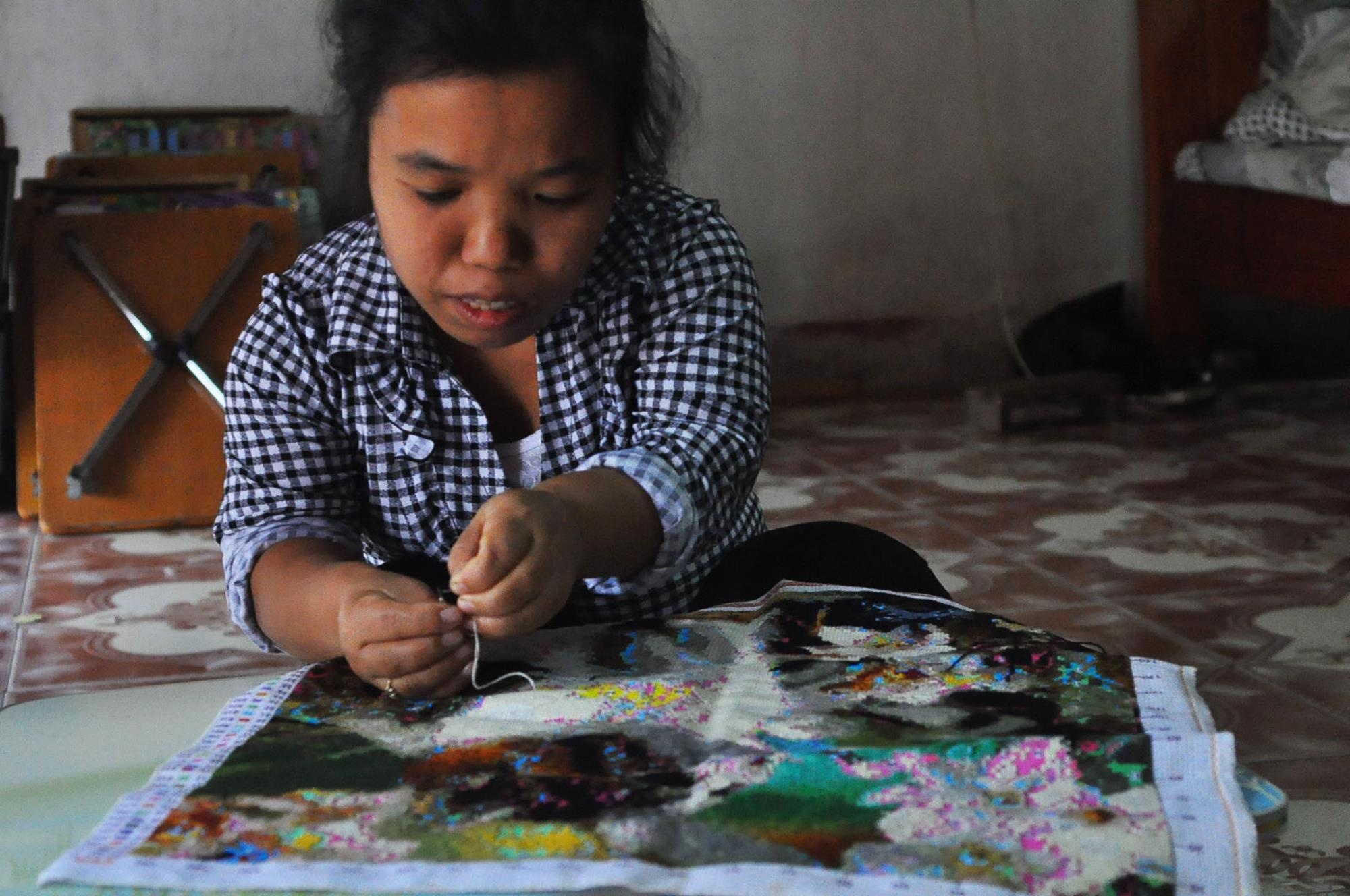 | Ngoài thời gian dạy học miễn phí cho các cháu nhỏ, chị Tuyết thích thêu tranh tặng người thân. |