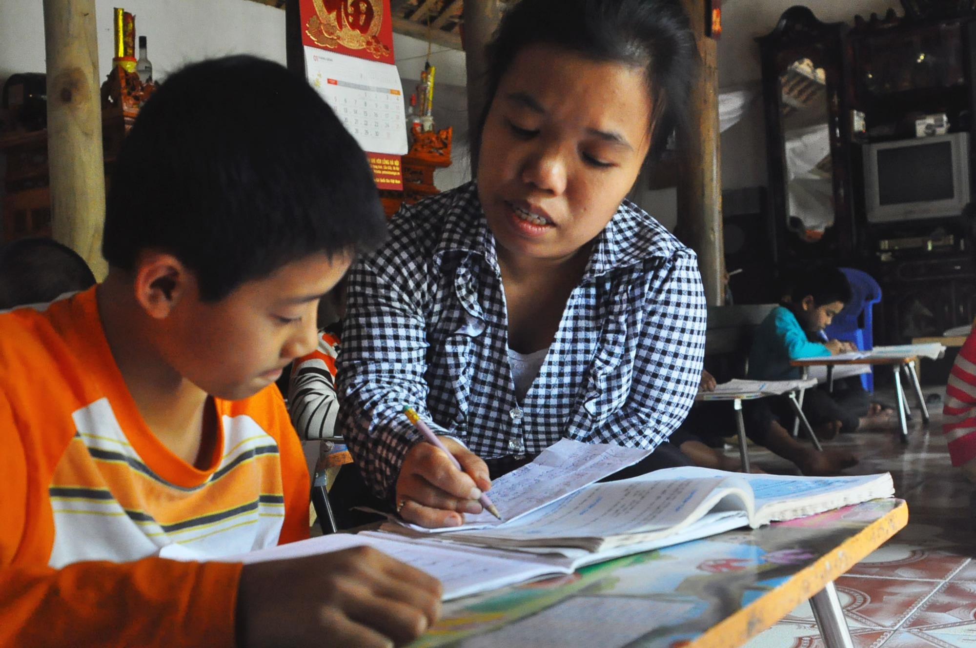 | Lớp học đặc biệt này chia làm ca sáng và chiều vào thứ 7, chủ nhật mỗi tuần. Chị Đạm dạy kèm, hướng dẫn giải các bài tập về nhà cho các em Trường tiểu học Cao Phong tại căn nhà ba gian của bố mẹ. |