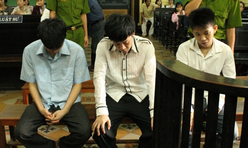 | Từ trái qua: Trân, Quang và Lên tại tòa sơ thẩm. |