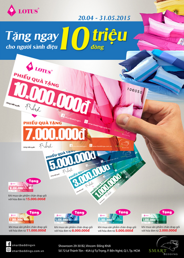 Nhân dịp trong tháng có nhiều ngày đại lễ trọng đại của đất nước, ngày lễ giỗ tổ Hùng Vương, ngày lễ 30/4 và ngày lễ 1/5, nhà phân phối Smartbedding - Công ty cổ phần Hội tụ Thông minh cùng nhãn hàng chăn ga gối nệm cao cấp Lotus dành tặng người tiêu dùng Việt Nam những sản phẩm tốt nhất cùng ưu đãi lớn. Thời gian diễn ra chương trình là từ 20/4 đến 31/5 với hóa đơn từ 2 triệu đồng trở lên, khách hàng sẽ nhận được những quà tặng dưới đây: