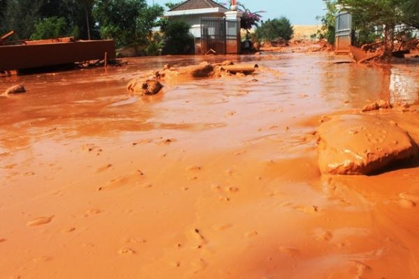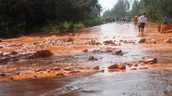 ‘Lũ’ bùn đỏ titan tràn lênh láng, trôi 3 xe máy