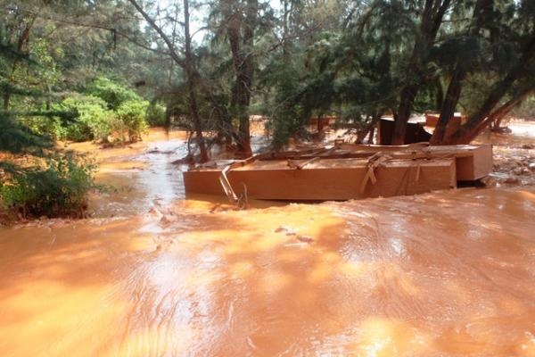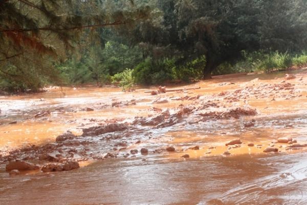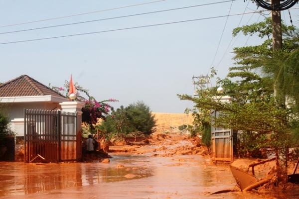 Nước bùn đỏ chảy từ phía trong công ty cuốn theo nhiều vật dụng khai thác bằng kim loại nằm ngổn ngang trên đường. Một trụ điện phía trong công ty bị ngã đổ. Lượng bùn đóng trên mặt đường ngập đến đầu gối.