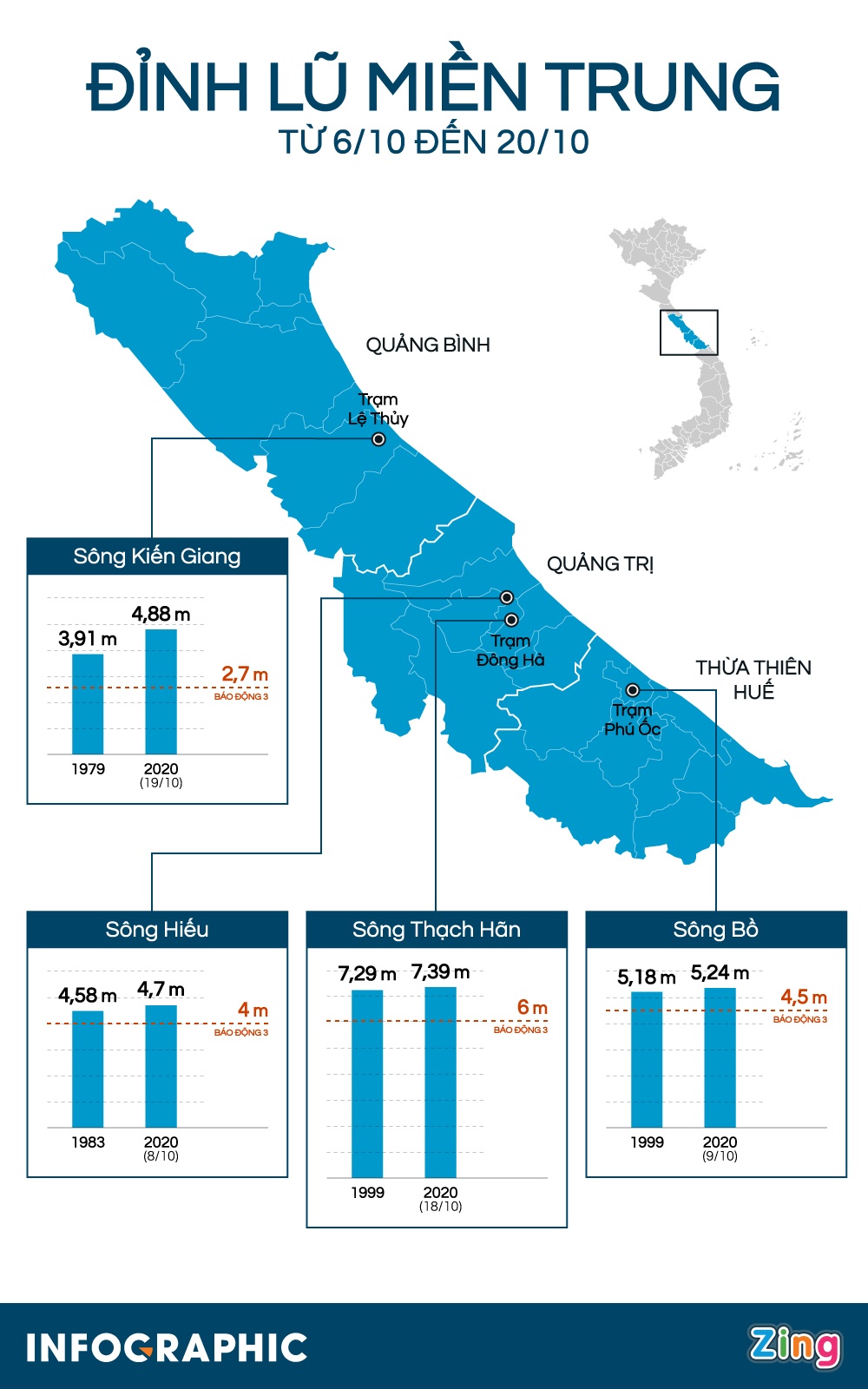 Mưa lớn kéo dài và dồn dập suốt hai tuần khiến nhiều sông ở các tỉnh từ Quảng Bình đến Thừa Thiên - Huế ghi nhận đỉnh lũ cao chưa từng có, vượt lũ lịch sử.