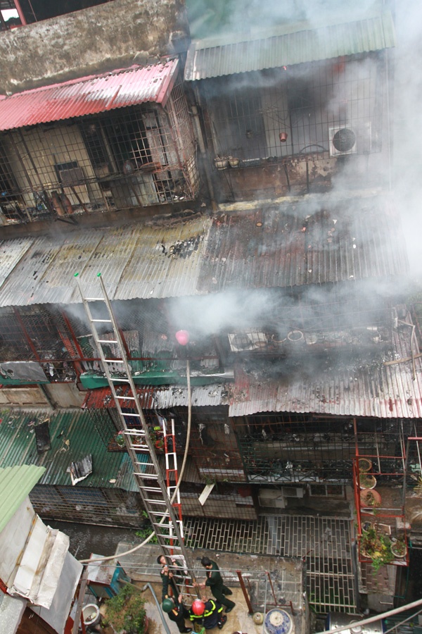 | Đám cháy được dập tắt và lực lượng CA phường Nam Đồng đã phong toả hiện trường để chờ cơ quan điều tra đến khám. Hiện trường đám cháy gồm có 5 căn nhà: 302, 403,404, 503, 504. Hầu hết các căn nhà đều cháy phần chuồng cọp và gian phòng giáp chuồng cọp. |