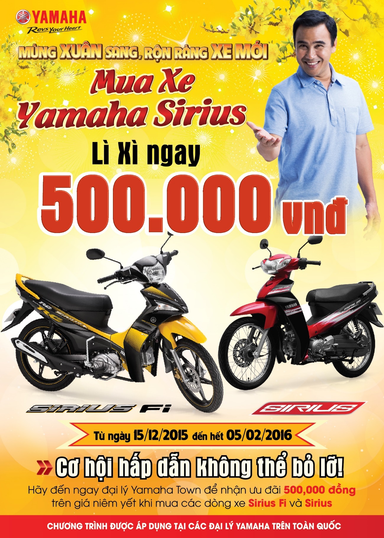 Hiện tại, Yamaha vừa giới thiệu thêm màu mới cho cả hai phiên bản chế hòa khí và phun xăng điện tử cho Sirius, đồng thời giới thiệu chương trình khuyến mãi đón Tết Mừng xuân sang, rộn ràng xe mới. Từ ngày 15/12/2015 đến ngày 5/2/2016, khi mua xe Sirius và Sirius Fi tại bất kỳ đại lý Yamaha nào trên toàn quốc, bạn đều nhận ngay lì xì từ Yamaha lên đến 500.000 đồng trên giá bán niêm yết. Đây chính là thời điểm thích hợp nhất để bạn sở hữu ngay chiếc xe số “huyền thoại” này, đón chờ một mùa xuân Bính Thân với hành trình như ý.