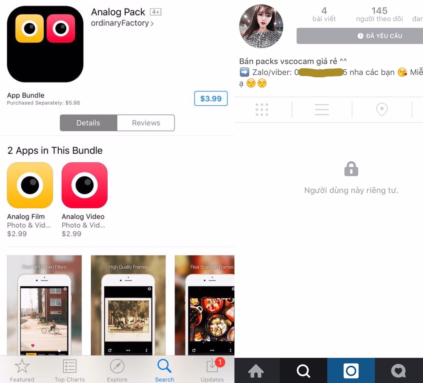Chị M. có ý định tìm ứng dụng chụp ảnh trên App Store mang tên Analog Pack (giá 3,99 USD). Khi lướt Instagram, chị thấy có quảng cáo mua phần mềm này với giá 20.000 đồng, thanh toán bằng thẻ điện thoại. Thấy mức giá hời, người này đã liên hệ để mua.