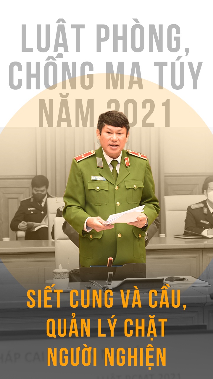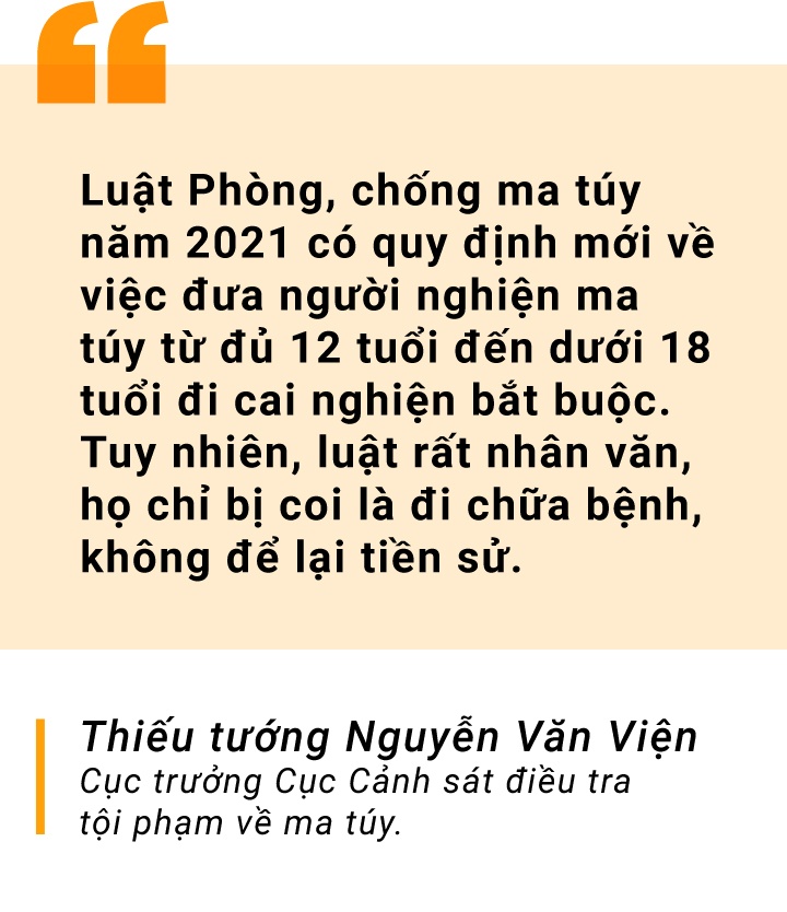 Đáng chú ý, trước thực trạng người sử dụng ma túy đang trẻ hóa, Cục trưởng Cục Cảnh sát điều tra tội phạm về ma túy nhấn mạnh Luật Phòng, chống ma túy năm 2021 có quy định mới về việc đưa người nghiện ma túy từ đủ 12 tuổi đến dưới 18 tuổi đi cai nghiện bắt buộc. Tuy nhiên luật rất nhân văn, họ chỉ bị coi là đi chữa bệnh, không để lại tiền sử và không ảnh hưởng đến thời gian sau này. Họ cũng có một nơi cai nghiện riêng theo hướng dẫn của Bộ Y tế.