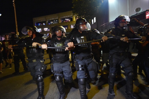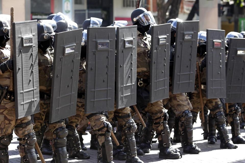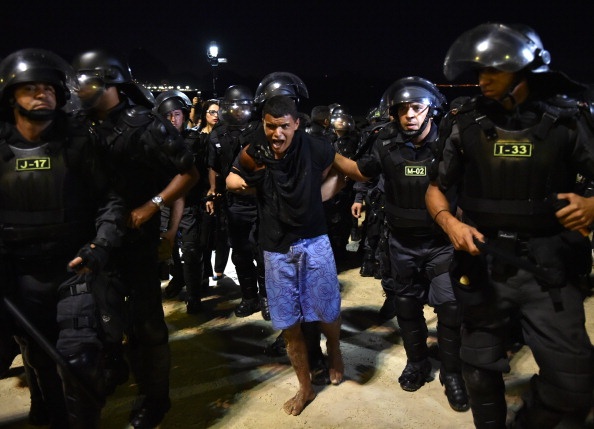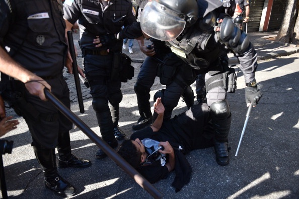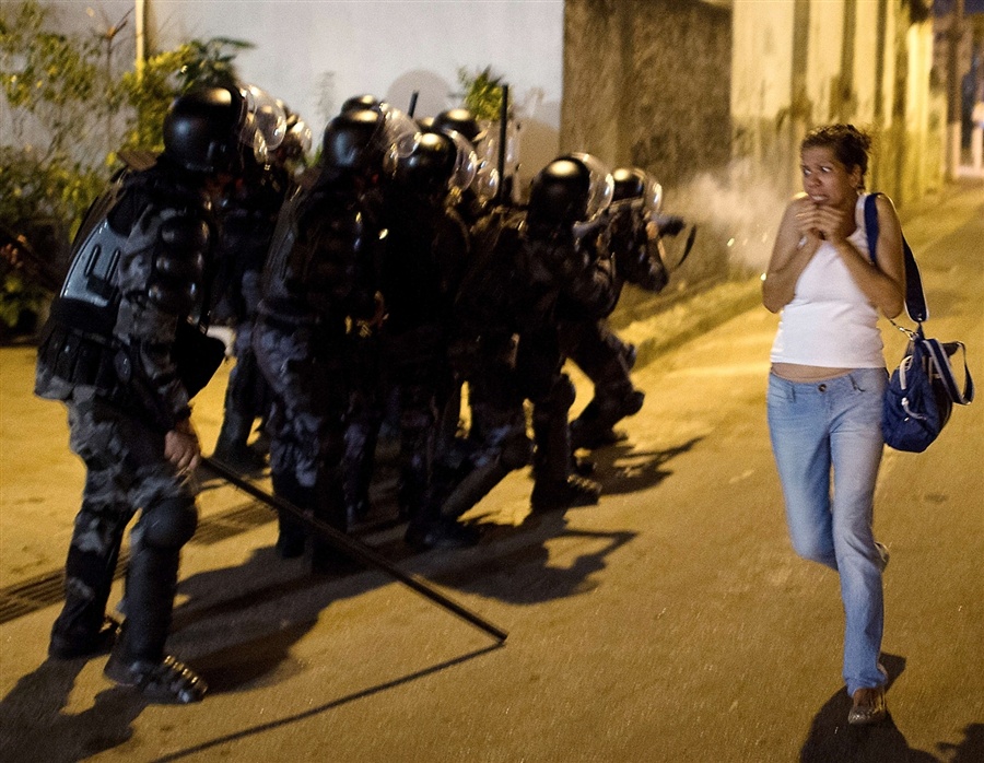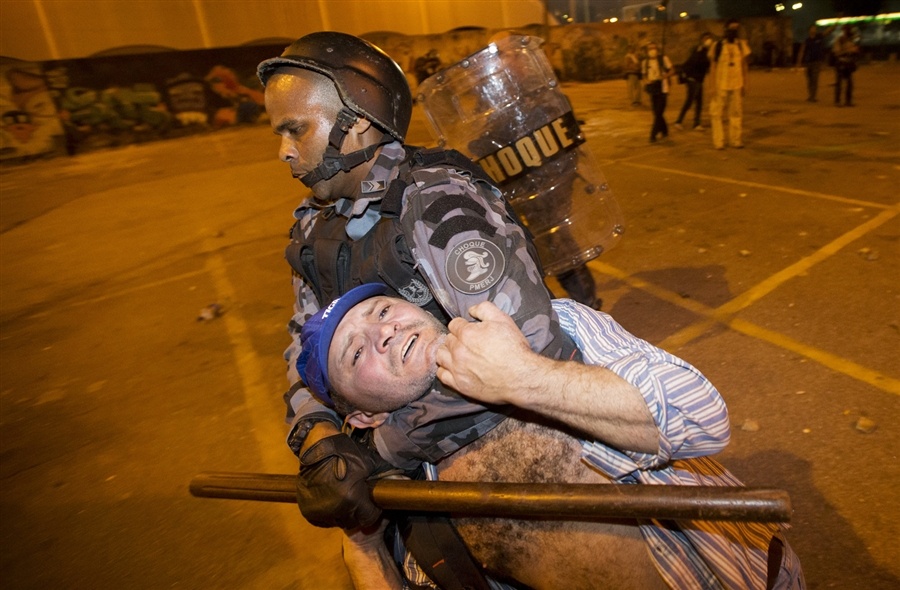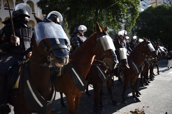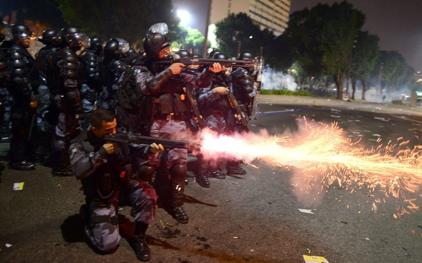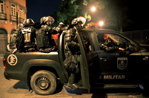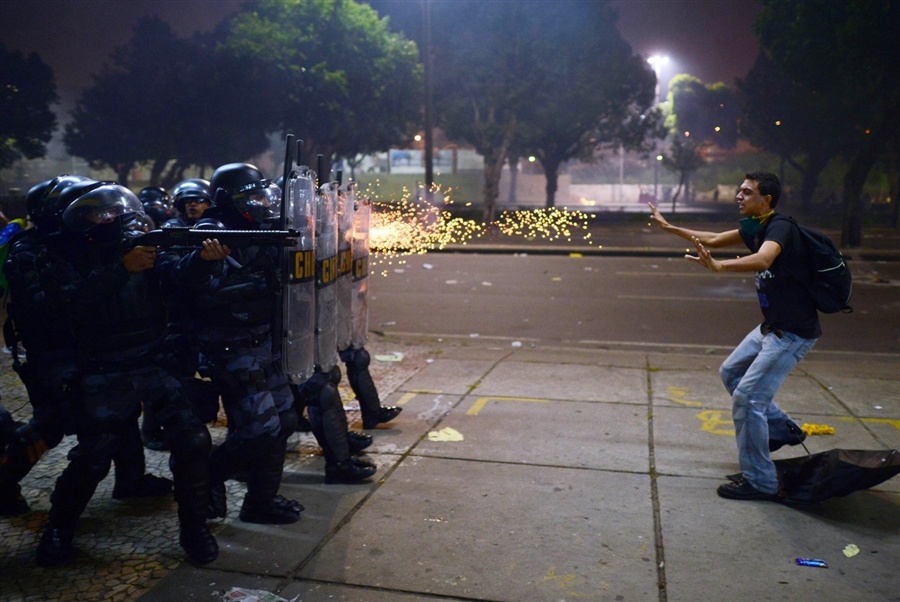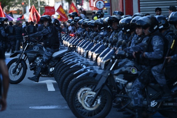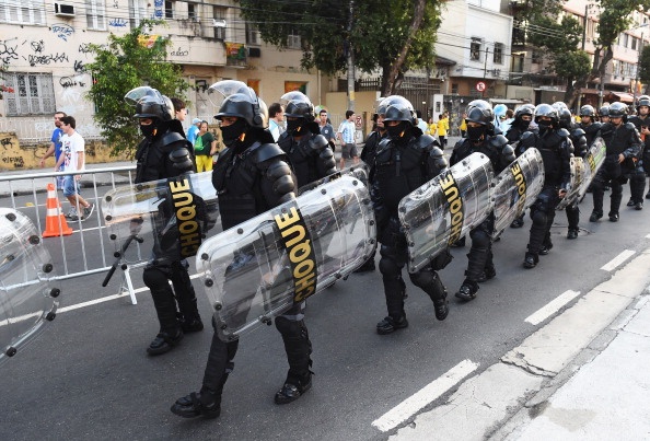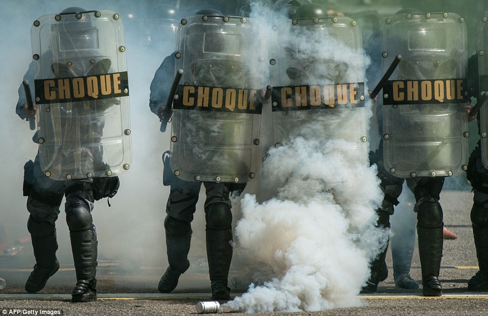 Cảnh sát Brazil được trang bị đầy đủ mũ bảo hiểm, áo giáp, khiên chống đạn để chống bạo loạn.
