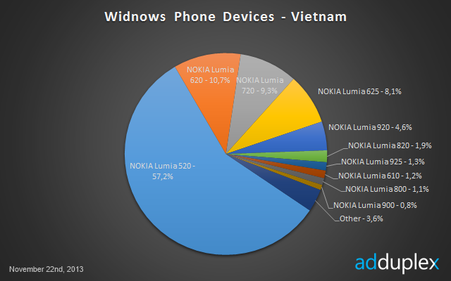 | Thị phần điện thoại chạy Windows Phone tại Việt Nam, theo báo cáo của AdDuplex. |
