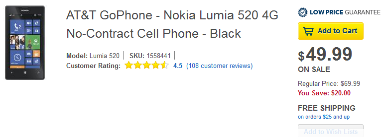Nhân dịp lễ Phục Sinh, Best Buy vừa áp dụng chương trình ưu đãi đặc biệt dành cho các khách hàng thân thiết khi mua Lumia 520. Người dùng chỉ cần bỏ ra 49,99 USD là có thể sở hữu ngay một chiếc điện thoại giá rẻ. Mô hình bán ra trong đợt giảm giá lần này là bản của nhà mạng AT&T. Chính sách giảm giá chỉ áp dụng trong ngày Chủ nhật của Lễ phục sinh vừa qua. Sau thời gian đó, giá sẽ được đưa về mức cũ là 69,99 USD.