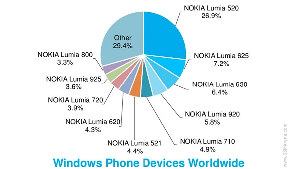 Theo đó, trên thị phần các thiết bị, chiếc smartphone giá rẻ Lumia 520 của Nokia (trước đây) tiếp tục thống trị với 26,9%, bỏ xa sản phẩm đứng thứ 2 là Lumia 625 với chỉ 7,2% thị phần.
