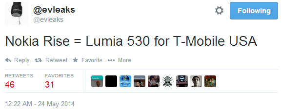 Theo tài khoản @evleaks, chiếc điện thoại này có tên gọi là Nokia Rise và sẽ được phân phối chính thức bởi nhà mạng T-Mobile tại Mỹ. Đây không phải là lần đầu tiên Lumia 530 xuất hiện trong những tin đồn. Trước đó nhiều nguồn tin khẳng định Nokia Rock sẽ là tên gọi chính thức của chiếc điện thoại này.