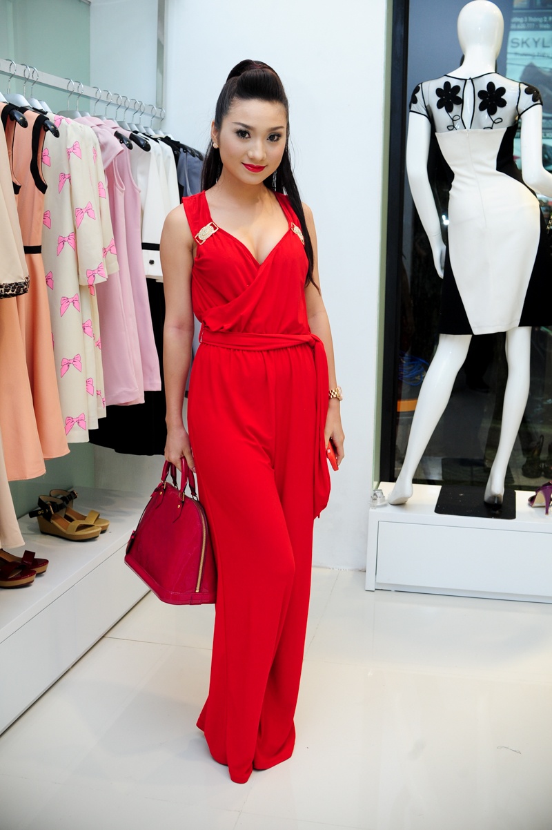 | Cao Mỹ Kim cũng nổi bật không thua kém Lương Bích Hữu khi xuất hiện với trang phục đỏ cá tính. |