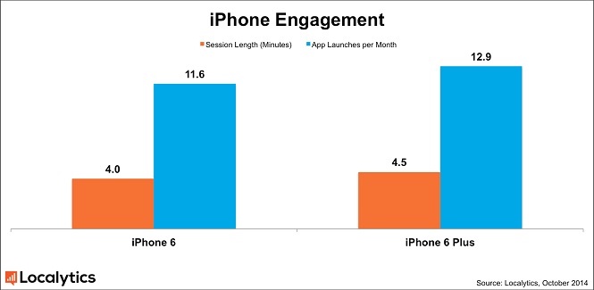 Localytics cũng cho biết thêm, mặc dù số lượng iPhone 6 bán ra nhiều hơn so với iPhone 6 Plus nhưng nếu xét về số lần khởi động và thời gian dành cho các ứng dụng thì chiếc phablet iPhone 6 Plus lại vượt trội hơn. Điều này cho thấy xu hướng người dùng thích trãi nghiệm các ứng dụng trên màn hình to của iPhone 6 Plus hơn so với iPhone 6.