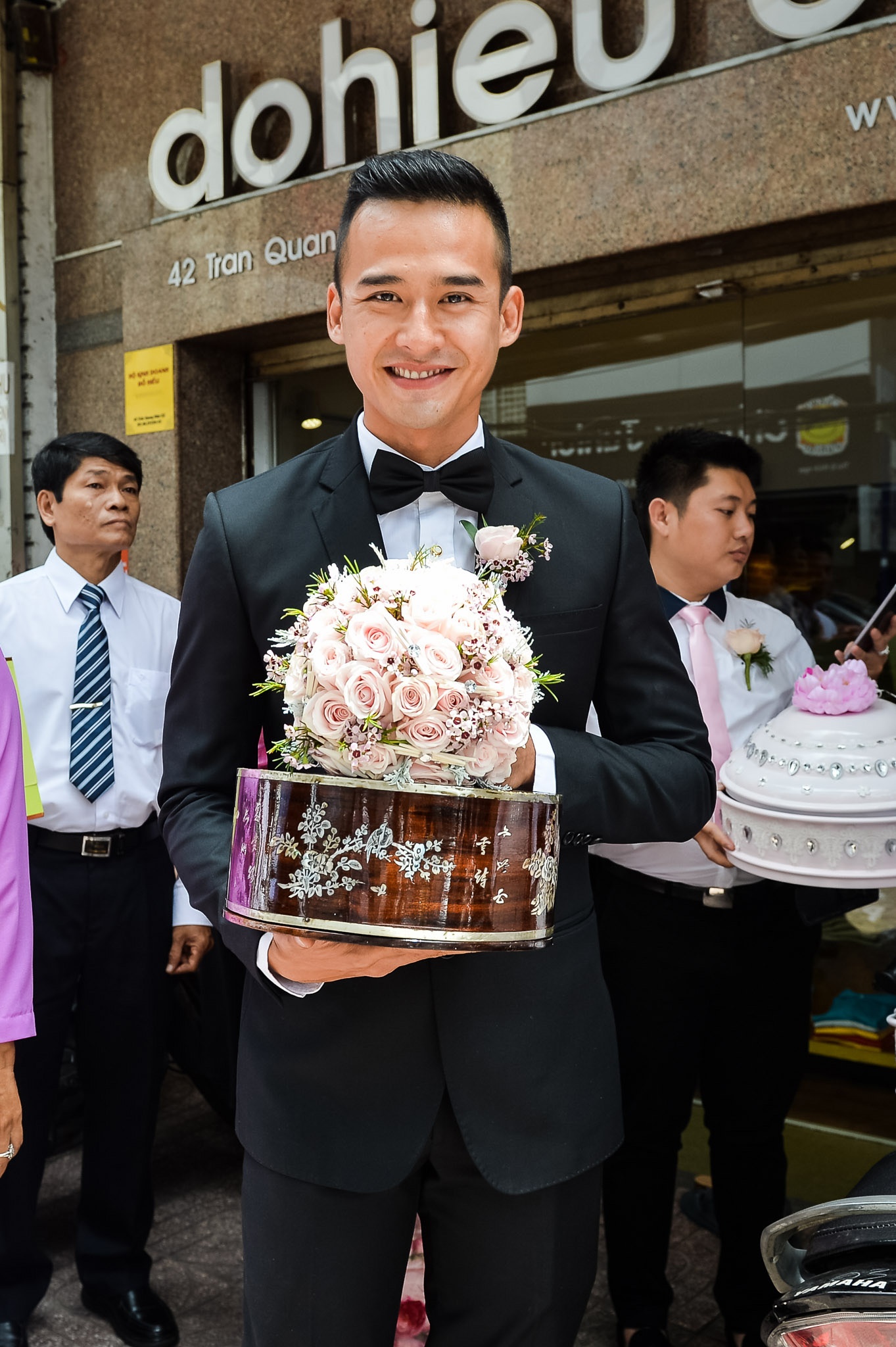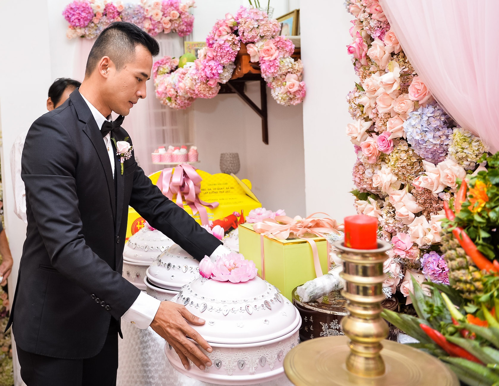 Anh cẩn thận sắp xếp lại từng tráp lễ gửi nhà gái.