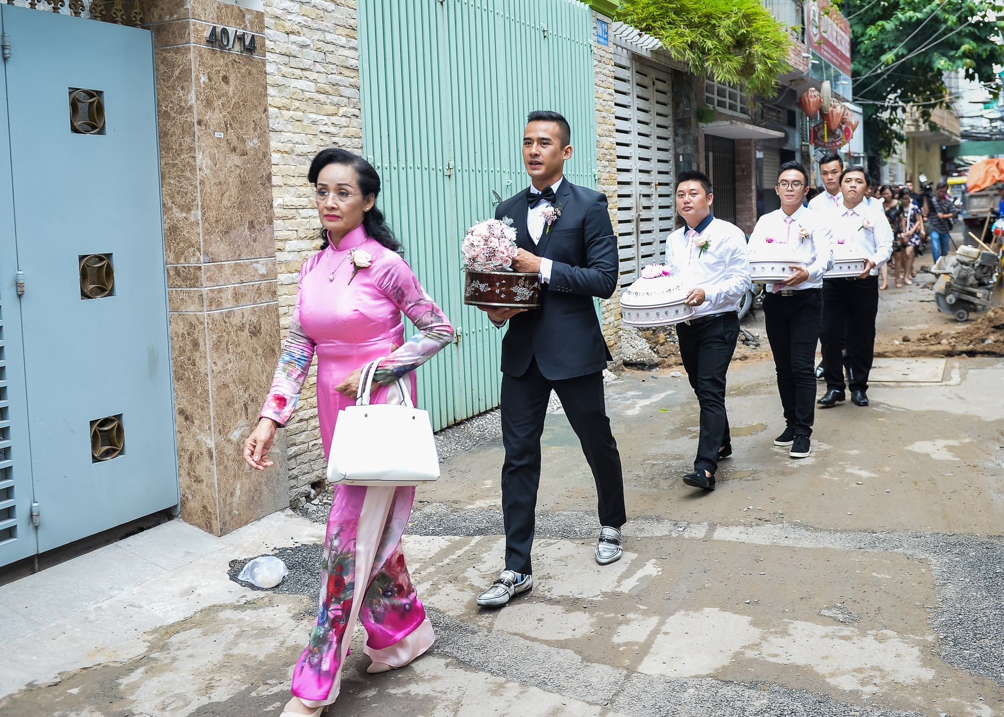 Lương Thế Thành và mẹ chuẩn bị tiến vào nhà cô dâu sau một chặng đường dài. Anh luôn cười rạng rỡ khi gặp mọi người và thoải mái chia sẻ cảm xúc bản thân trong ngày vui, trong khi Thúy Diễm lại dè dặt và kín tiếng.