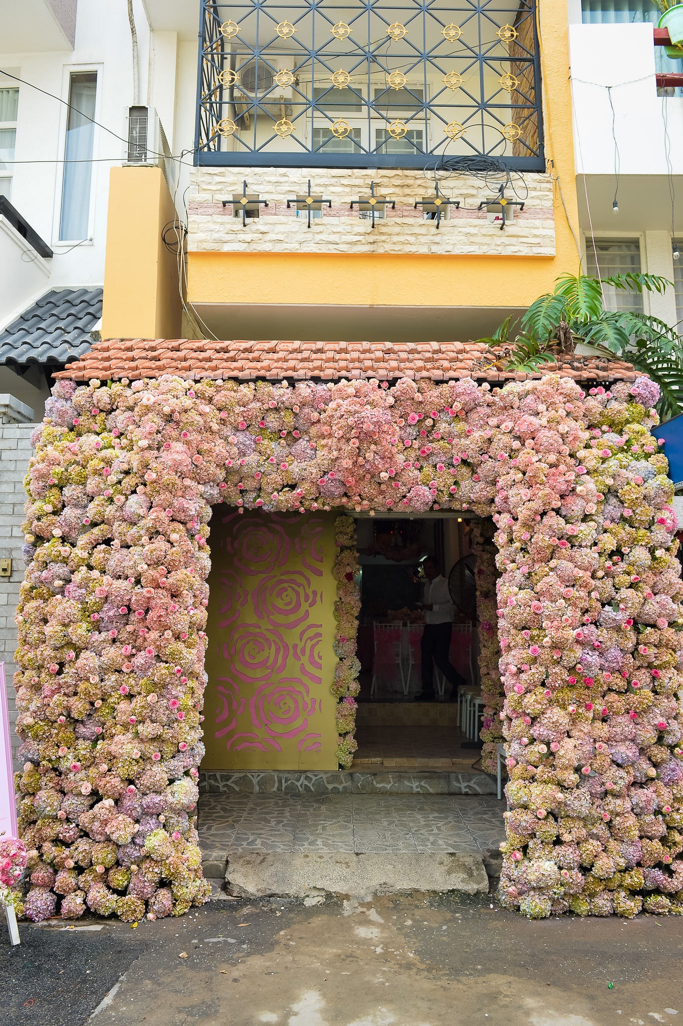 | Toàn bộ không gian tiệc đính hôn được Thúy Diễm trang trí bằng tông màu hồng, nhà cô dâu tràn ngập sắc hoa hồng và cẩm tú cầu. Vốn là người khéo tay nên dù thuê người thiết kế nhưng Thúy Diễm vẫn kiểm tra từng chi tiết để ngày trọng đại thêm hoàn hảo. |