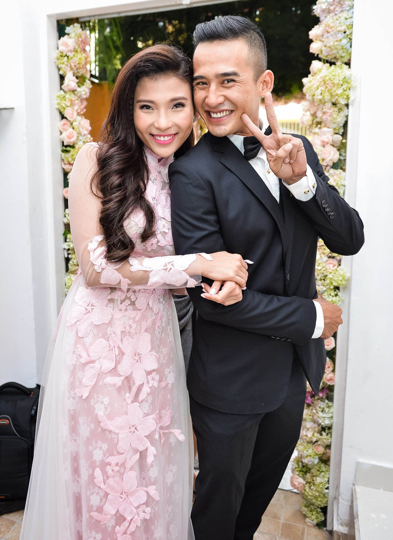 | Sau những giờ làm lễ trang trọng, cặp đôi nhí nhảnh trước ống kính. |