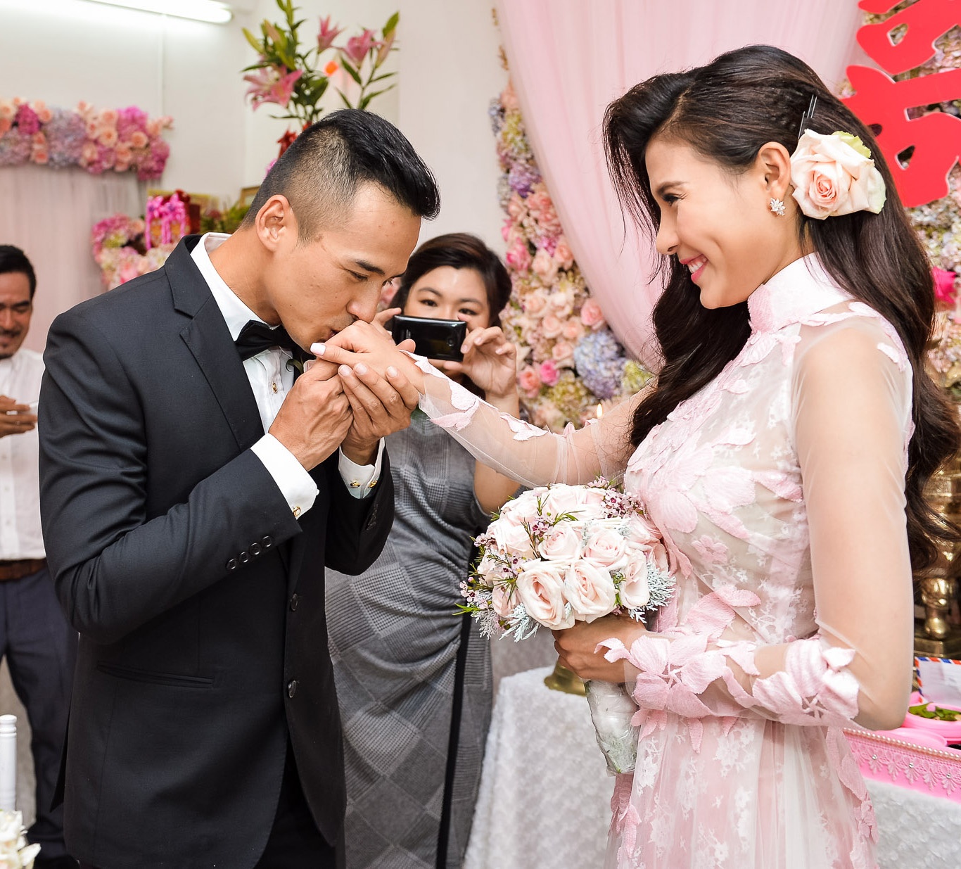 Lương Thế Thành hôn tay vợ sau khi trao nhẫn đính hôn. Trong ngày sinh nhật cách đây 2 năm của Thúy Diễm, Lương Thế Thành đã tặng bạn gái chiếc nhẫn hột xoàn thay lời cầu hôn. Hôm nay, anh cũng chuẩn bị một chiếc nhẫn hột xoàn khác tặng cô.