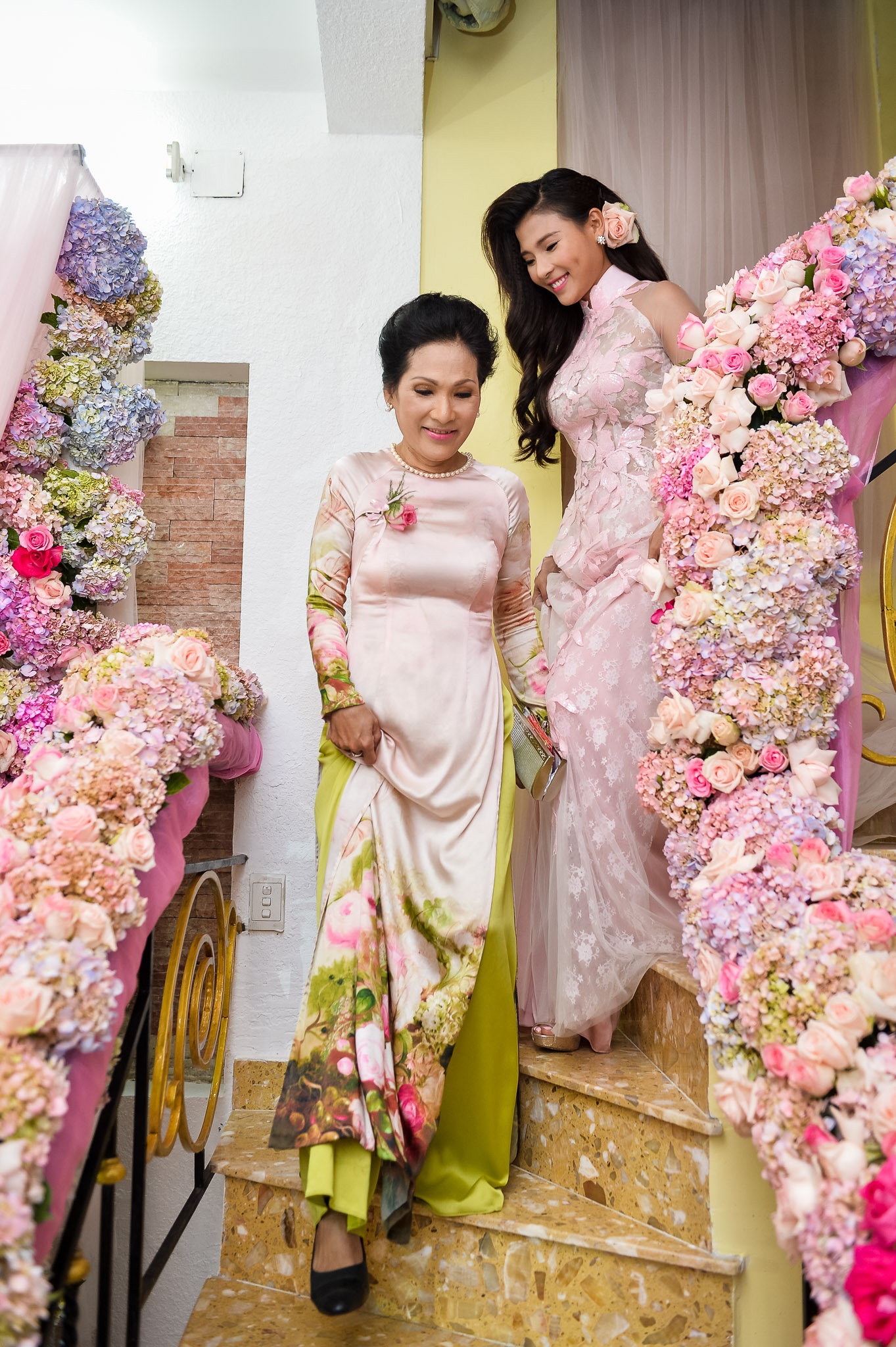 | Thúy Diễm cùng mẹ bước xuống đón nhà trai. Thúy Diễm từ nhỏ đã không sống gần cha nên bao nhiêu yêu thương, cô dành cả cho mẹ. |