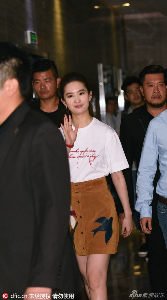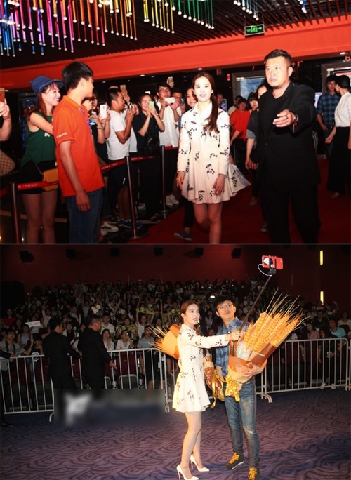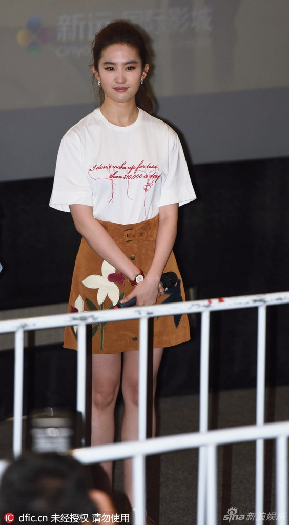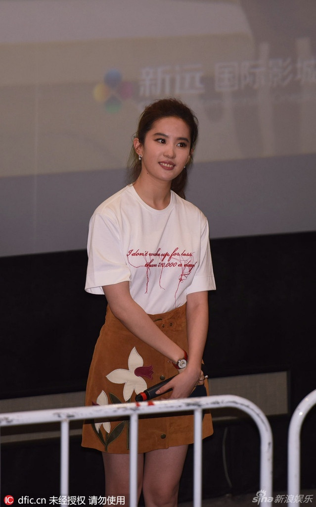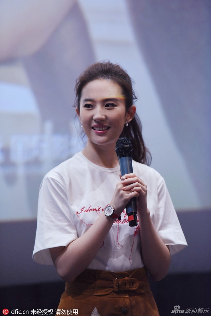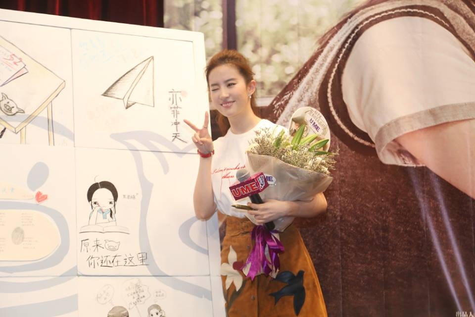 | Tối 4/7, Lưu Diệc Phi tham gia buổi quảng bá phim Hóa ra anh vẫn ở đây tổ chức tại Hàng Châu (Trung Quốc). Cô mặc áo phông phối chân váy giả bò đơn giản. Do lịch trình Ngô Diệc Phàm bận rộn nên anh không thể có mặt cùng nữ chính trong các sự kiện này. |