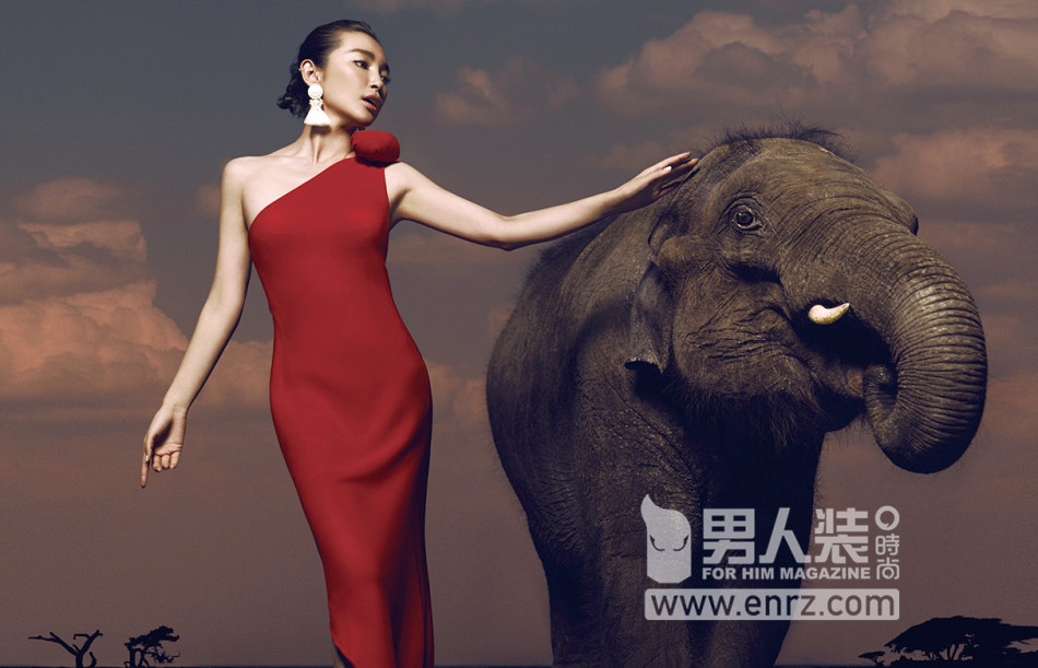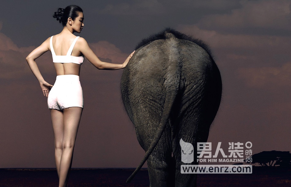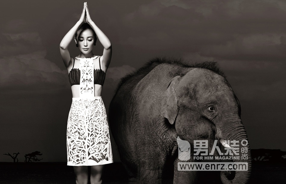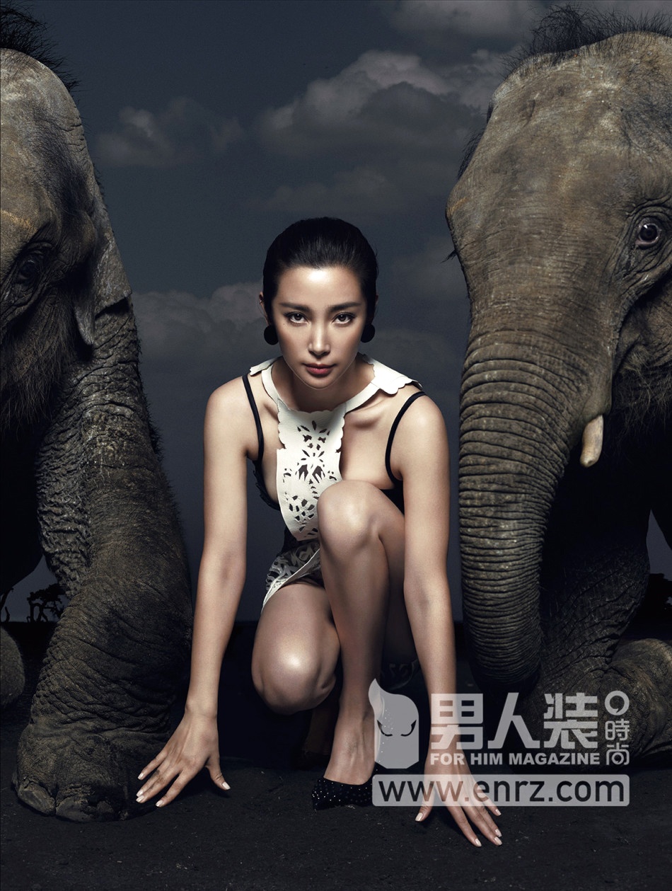 | Để chụp được bộ ảnh này, Lý Băng Băng phải làm việc rất vất vả bởi bạn diễn của cô là những chú voi khó bảo. |