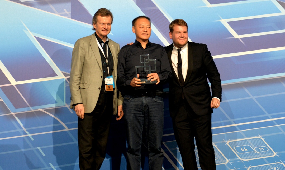| Chủ tịch kiêm CEO HTC - Peter Chou (giữa) nhận giải smartphone tốt nhất thế giới tại triển lãm MWC 2014. |