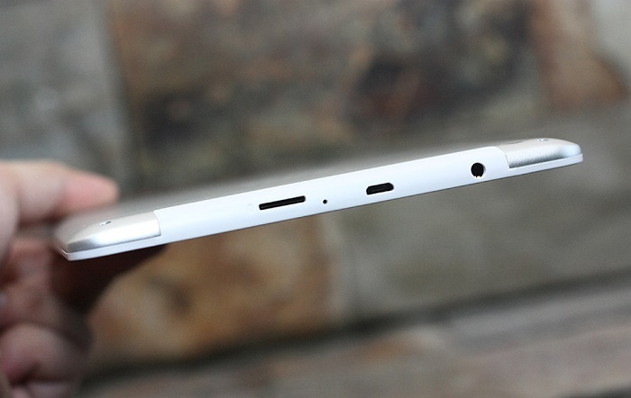 | Đỉnh máy gồm khe cắm thẻ nhớ trong, cổng sạc Micro-USB, jack cắm tai nghe 3,5 mm (từ trái qua). |