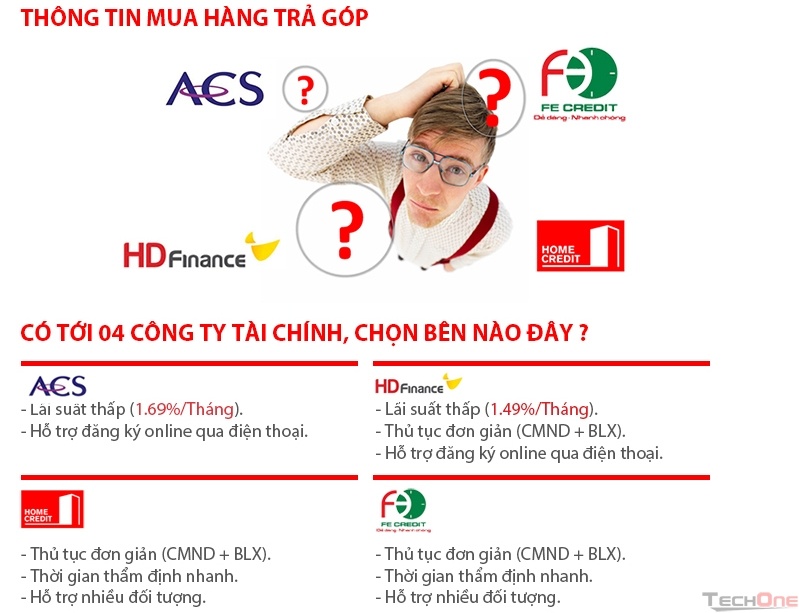 TechOne là một trong những đại lý hợp tác đầy đủ với 4 bên đơn vị trả góp truyền thống, với những ưu đãi và đặc điểm khác nhau. Khách hàng có thể thoải mái lựa chọn các hình thức và các bên trả góp phù hợp điều kiện, nhu cầu.