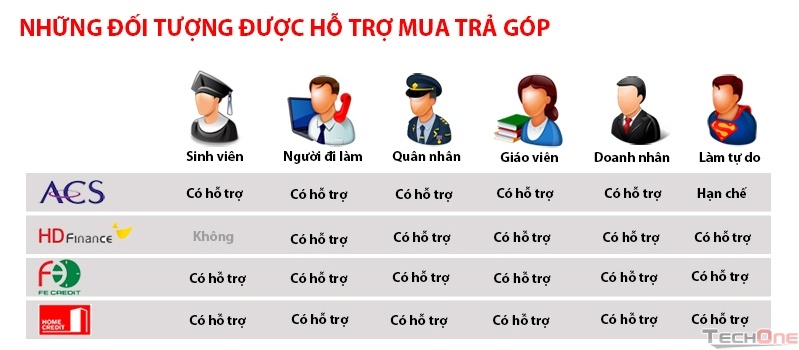 Hình thức mua hàng trả góp luôn luôn hỗ trợ đa dạng khách hàng, dù khách hàng là sinh viên, người đi làm, kinh doanh tự do, quân đội... và hầu như tất cả ngành nghề khác.