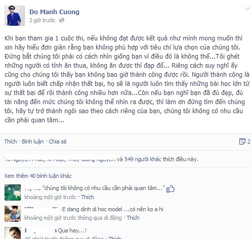 Anh đã viết trên trang cá nhân: "Khi bạn tham gia một cuộc thi, nếu không đạt được kết quả như mình mong muốn thì xin hãy hiểu đơn giản rằng bạn không phù hợp với tiêu chí lựa chọn của chúng tôi. Đừng bắt chúng tôi phải có cách nhìn giống bạn vì điều đó là không thể... Tôi ghét những người có tính ăn thua, không ăn được thì đạp đổ. Riêng cách suy nghĩ ấy cũng cho chúng tôi thấy bạn không bao giờ thành công được rồi.