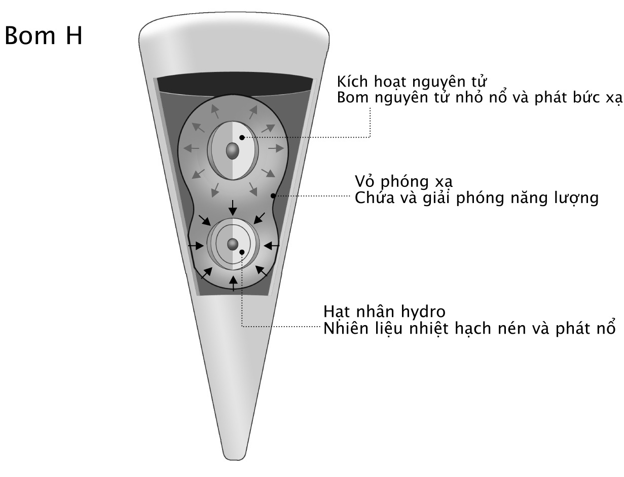 Trong khi đó, năng lượng của bom nhiệt hạch, phát sinh do phản ứng hợp hạch, từ các hạt nhân cỡ nhỏ như hydro kết hợp với nhau để tạo thành hạt nhân lớn hơn. Để kích hoạt quá trình nhiệt hạch, các hạt nhân cần nguồn năng lượng cực lớn nằm ngay bên trong lõi của bom hạt nhân.