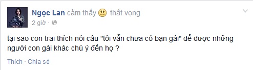 Mới đây, cô viết trên trang cá nhân: "Tại sao con trai thích nói câu 'Tôi vẫn chưa có bạn gái' để được những người con gái khác chú ý đến họ?".