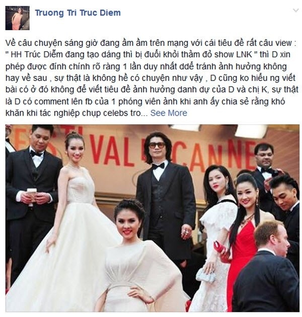 "Chị Kỳ ơi! em thấy là thảm đen mình mời đi hơi nhanh hơn bên Cannes đấy chị ạ, nhưng mà chỉ có chuyện bé thế này mà quên đi những phần tốt đẹp khác quả là không hay vì chị đã nỗ lực rất nhiều để đem đến sự hoàn hảo cho show lần này", hoa hậu thời trang Trúc Diễm nhắn gửi đàn chị.