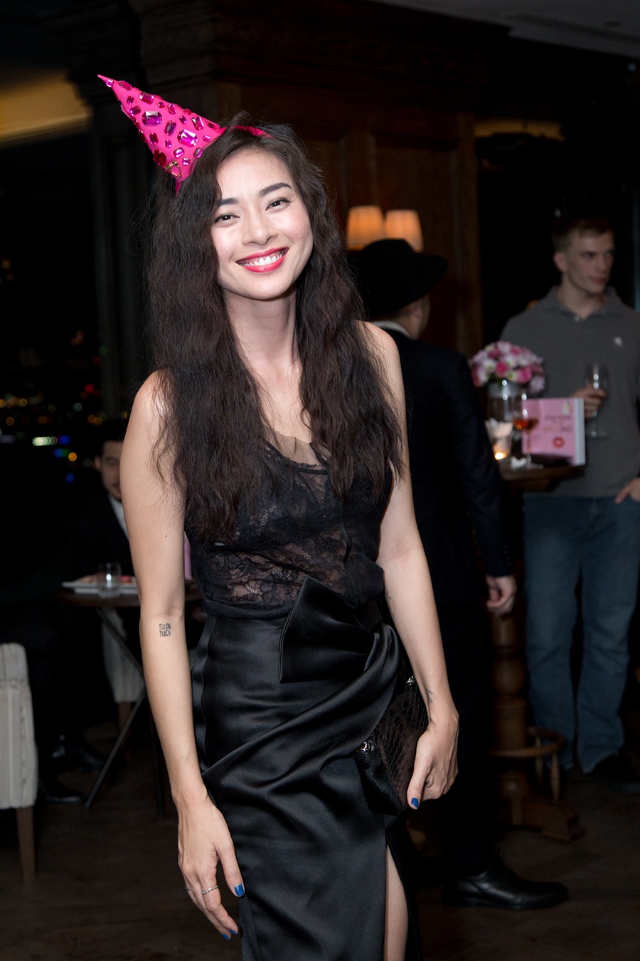 | Sau hơn ba tuần ra mắt sách Sống trong thế giới đàn ông, Hà Anh tổ chức tiệc mừng ấm cúng với bạn bè tại TP HCM, tối 28/1. Ngô Thanh Vân góp mặt ở buổi tiệc với trang phục áo xuyên thấu, phối chân váy xẻ. |