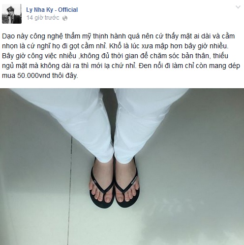 Người đẹp viết: "Dạo này công nghệ thẩm mỹ thịnh hành quá nên cứ thấy mặt ai dài và cằm nhọn là cứ nghĩ họ đi gọt cằm nhỉ. Khổ là lúc xưa mập hơn bây giờ nhiều. Bây giờ công việc nhiều, không đủ thời gian để chăm sóc bản thân, thiếu ngủ mặt mà không dài ra thì mới lạ chứ nhỉ. Đến nỗi đi làm chỉ còn mang dép mua 50.000 VNĐ thôi đây".