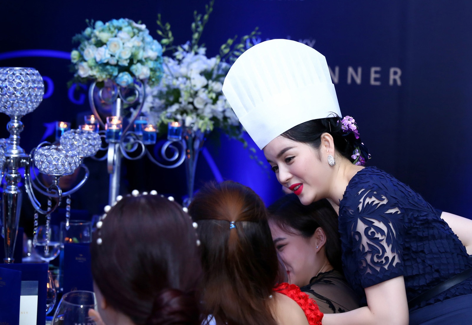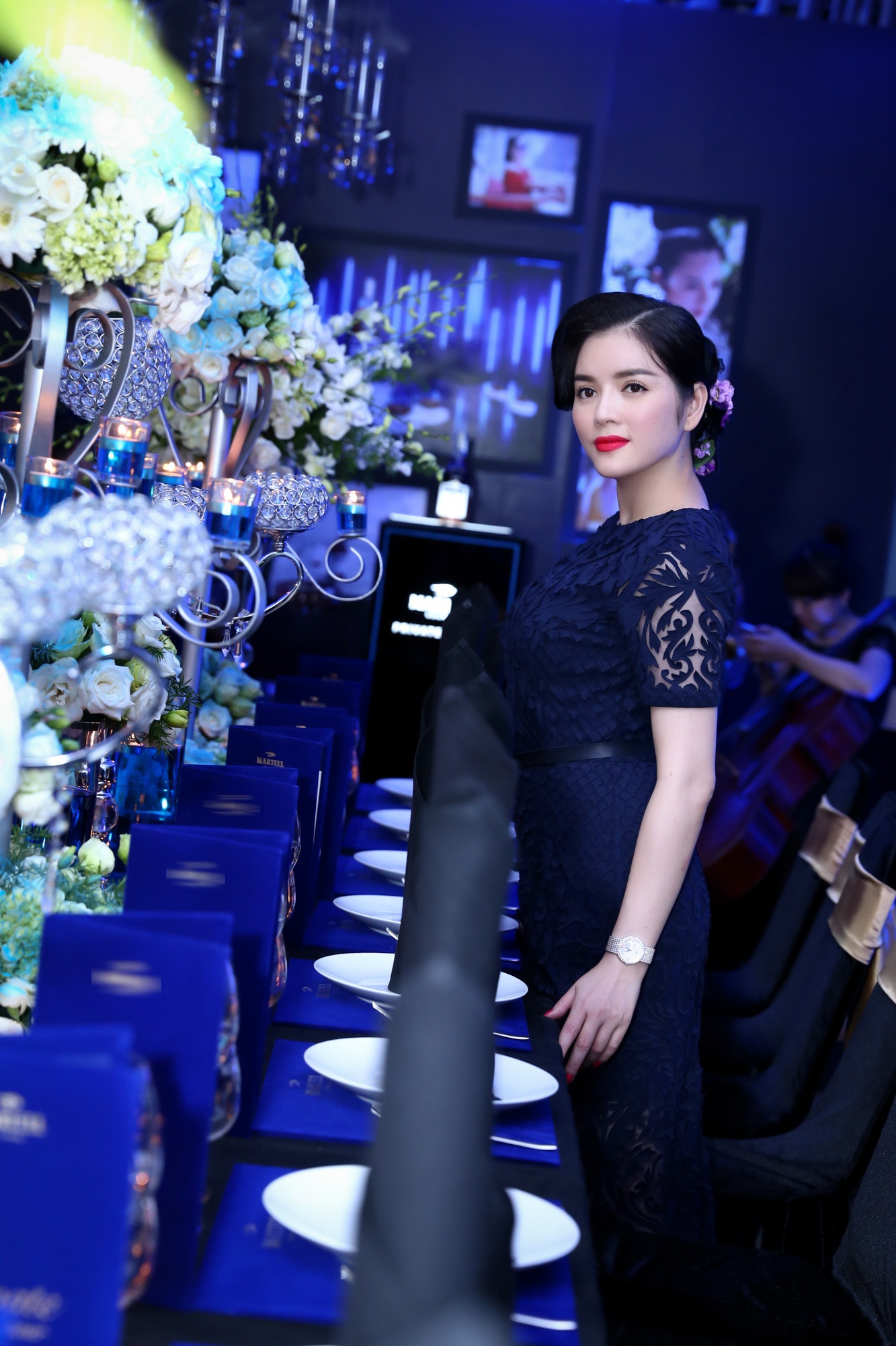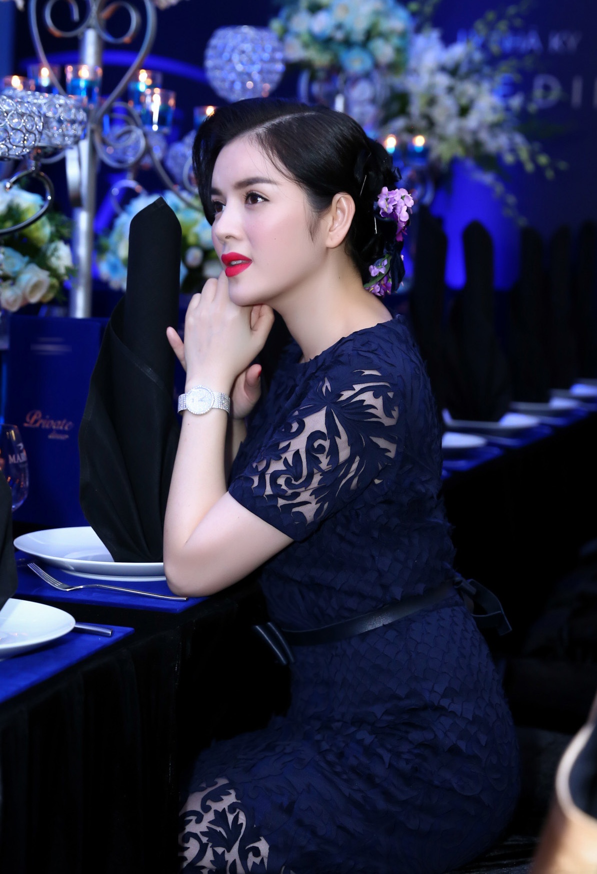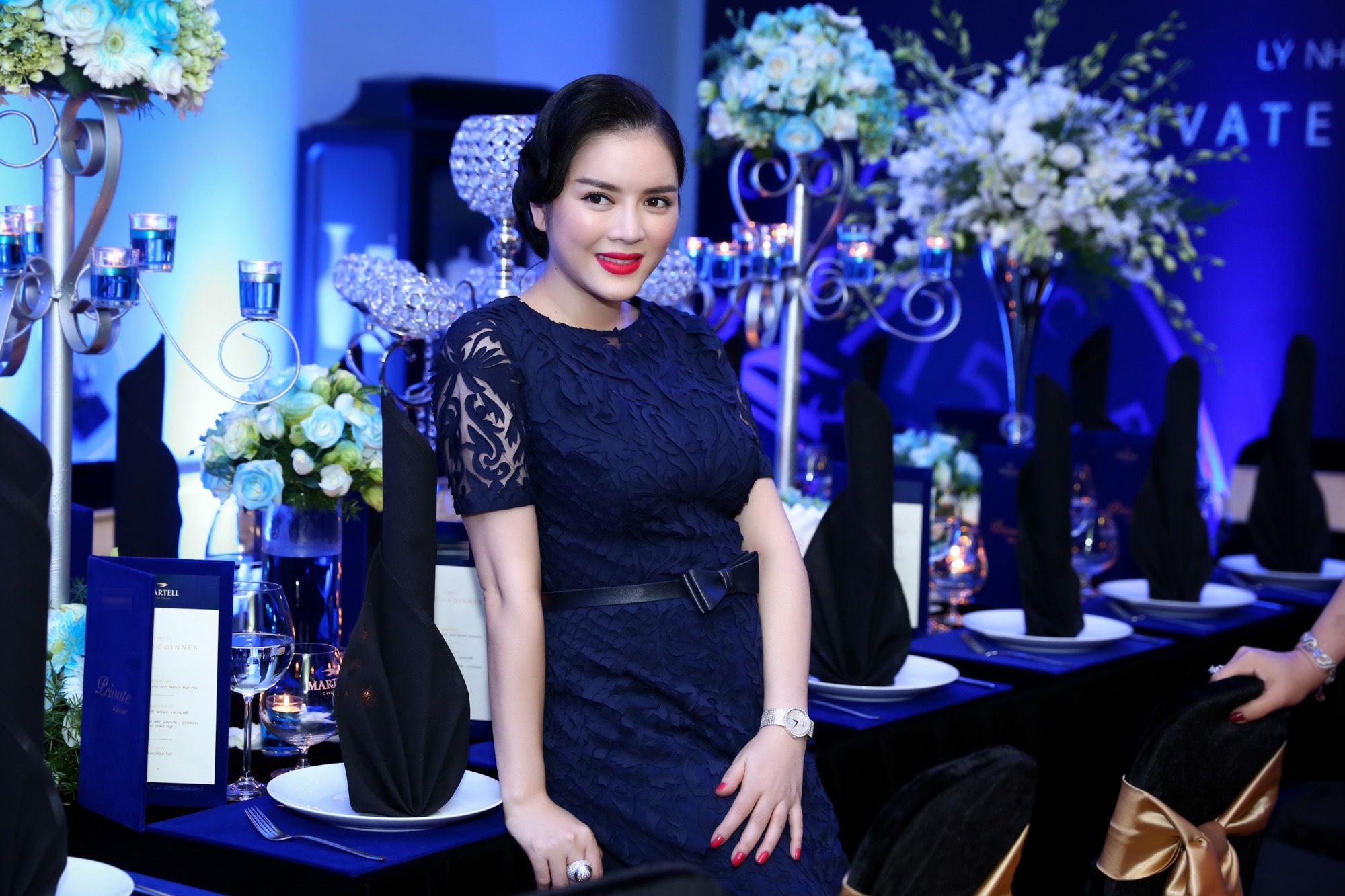 | Lý Nhã Kỳ xuất hiện ở buổi tiệc với trang phục ren cắt laser với những điểm nhấn xuyên thấu sang trọng và gợi cảm. Bữa tiệc của cô được phủ bằng màu xanh từ bàn tiệc đến những vật dụng trang trí khác. |