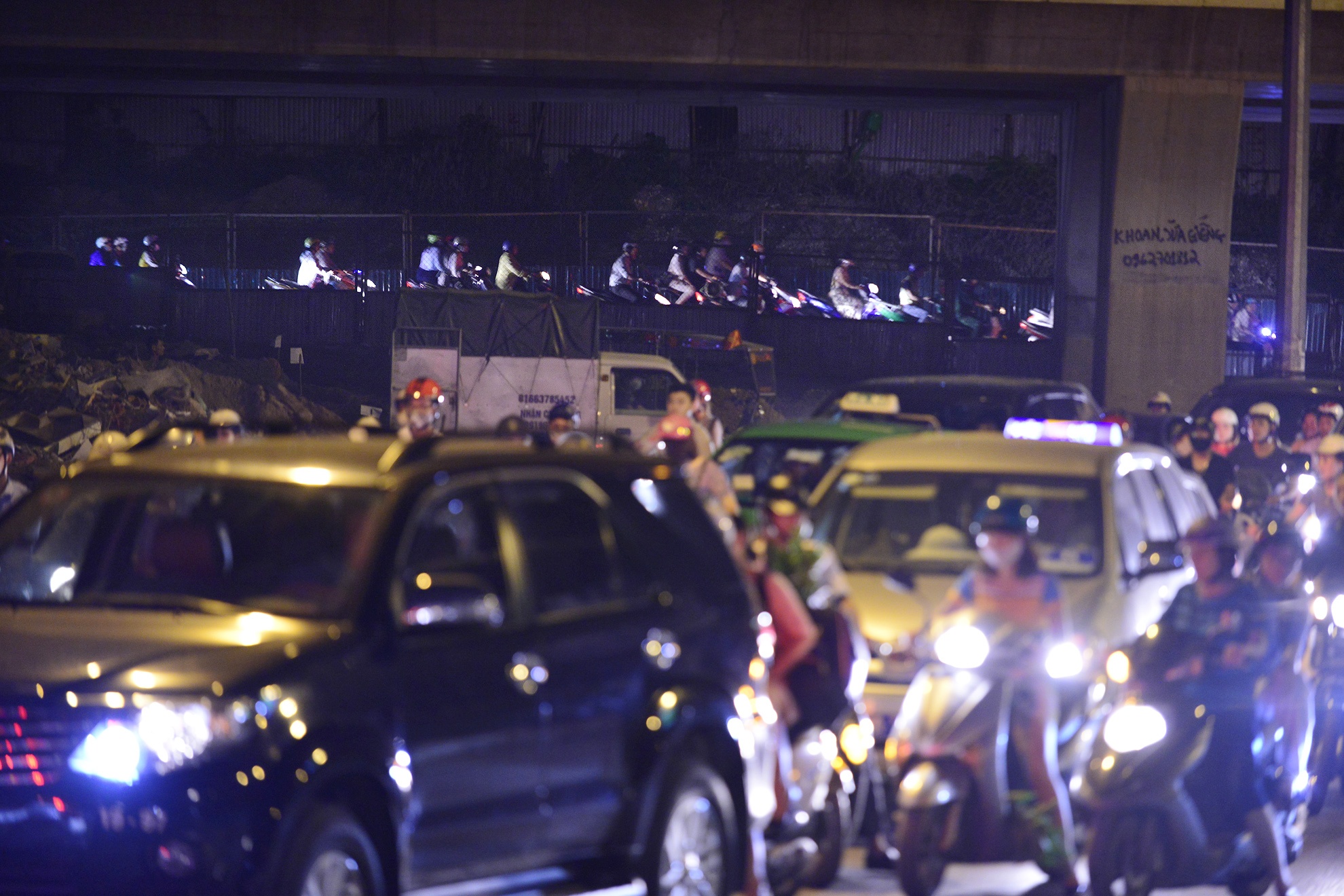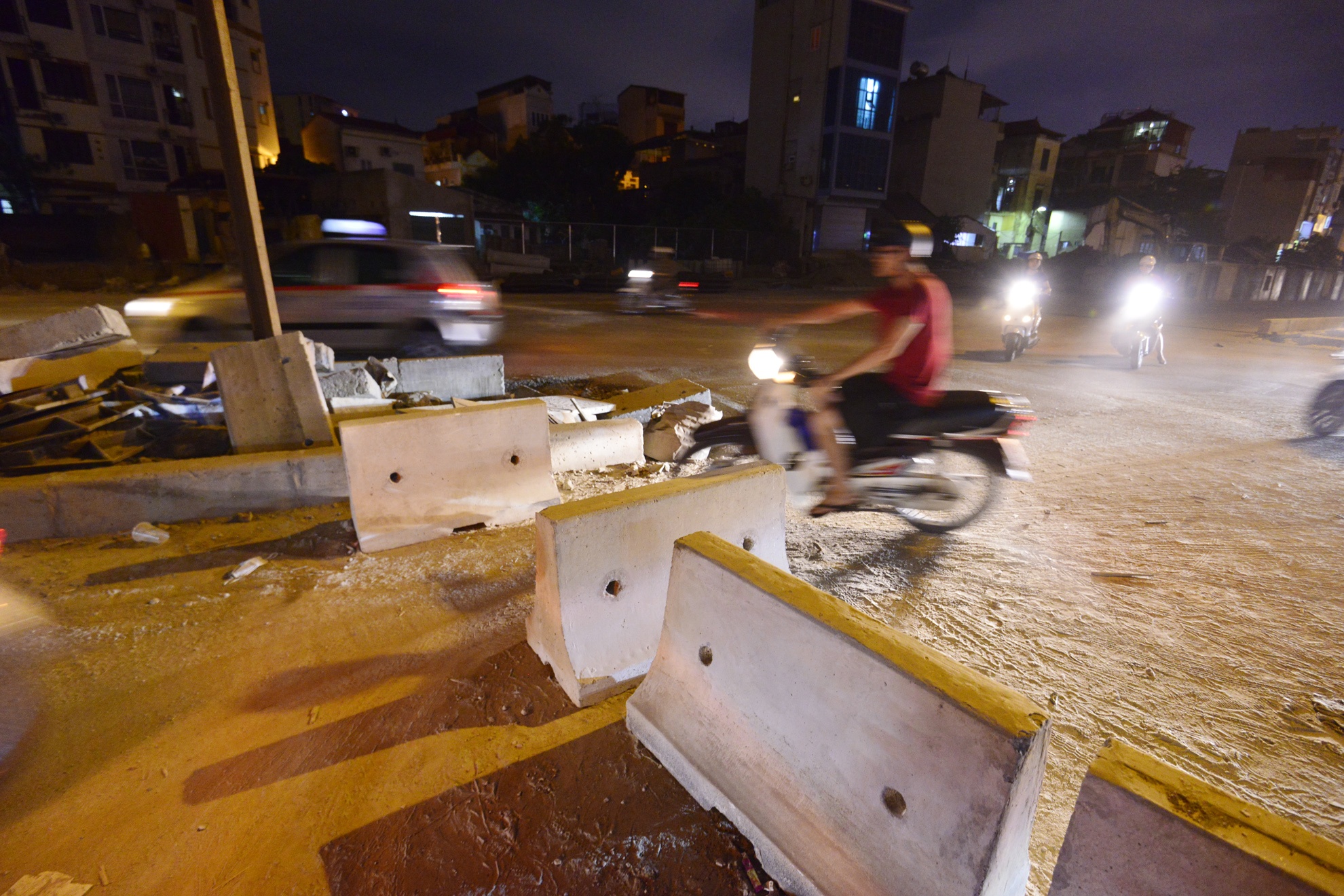 Các phương tiện sau khi đi từ Bưởi và Hoàng Quốc Việt vào con đường này thành nhiều luồng giao thông, thậm chí dỡ cả khối bê tông để mở đường đi lại cho tiện.