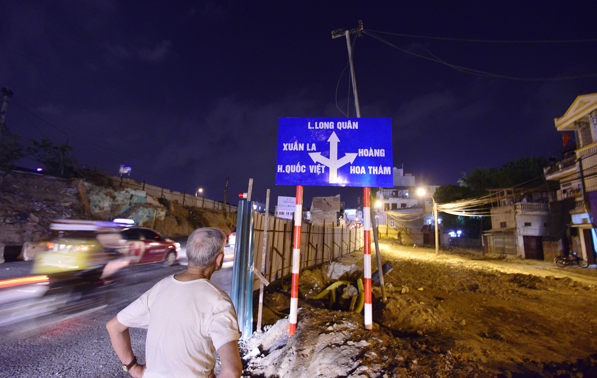 Biển chỉ dẫn được cắm trước khi cấm đường tại con dốc từ Bưởi xuống Hoàng Quốc Việt phục vụ công tác thi công, khiến nhiều người phải dừng lại ngó nghiêng, xem đường.