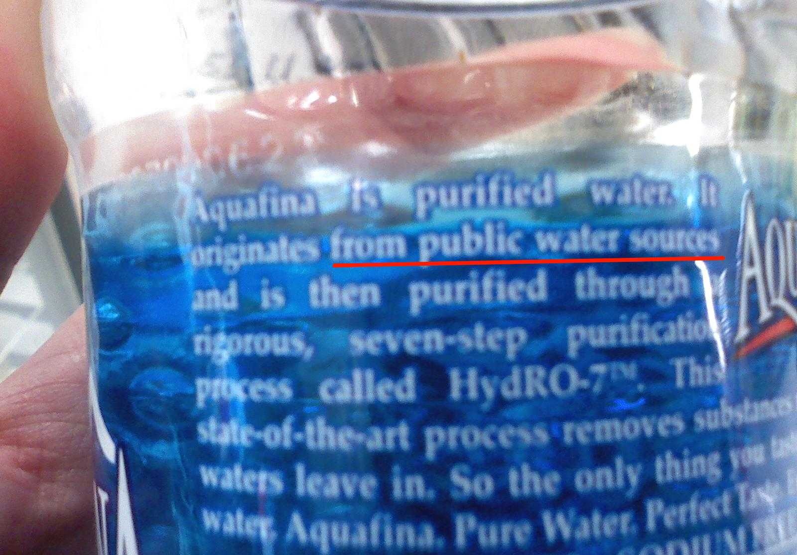 | Một hãng nước uống đóng chai thương hiệu quốc tế gần đây bị buộc phải ghi rõ nguồn nguyên liệu là "public water source" (nước máy) thay vì "pure water" (nước tinh khiết) để tránh gây nhầm lẫn cho khách hàng. Ảnh: katjuju. |