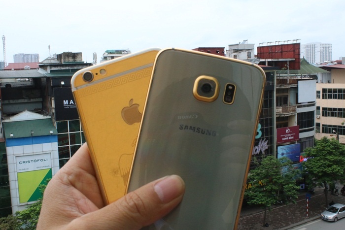 Galaxy S6 đọ dáng với một chiếc iPhone 6 mạ vàng.