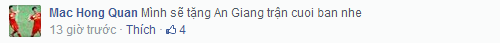 Trong khi Mạc Hồng Quân cùng các đồng đội ở An Giang đang phải nỗ lực tối đa để vượt qua rất nhiều khó khăn sau vụ lùm xùm trên sân Long Xuyên cuối tuần trước, một trang cá nhân có địa chỉ “Mac Hong Quan” đã bất ngờ tung ra thông tin tiền đạo Việt kiều CH Czech sẽ tặng áo đấu của anh cho các cổ động viên Thanh Hóa trong trận đấu diễn ra cuối tuần này.
