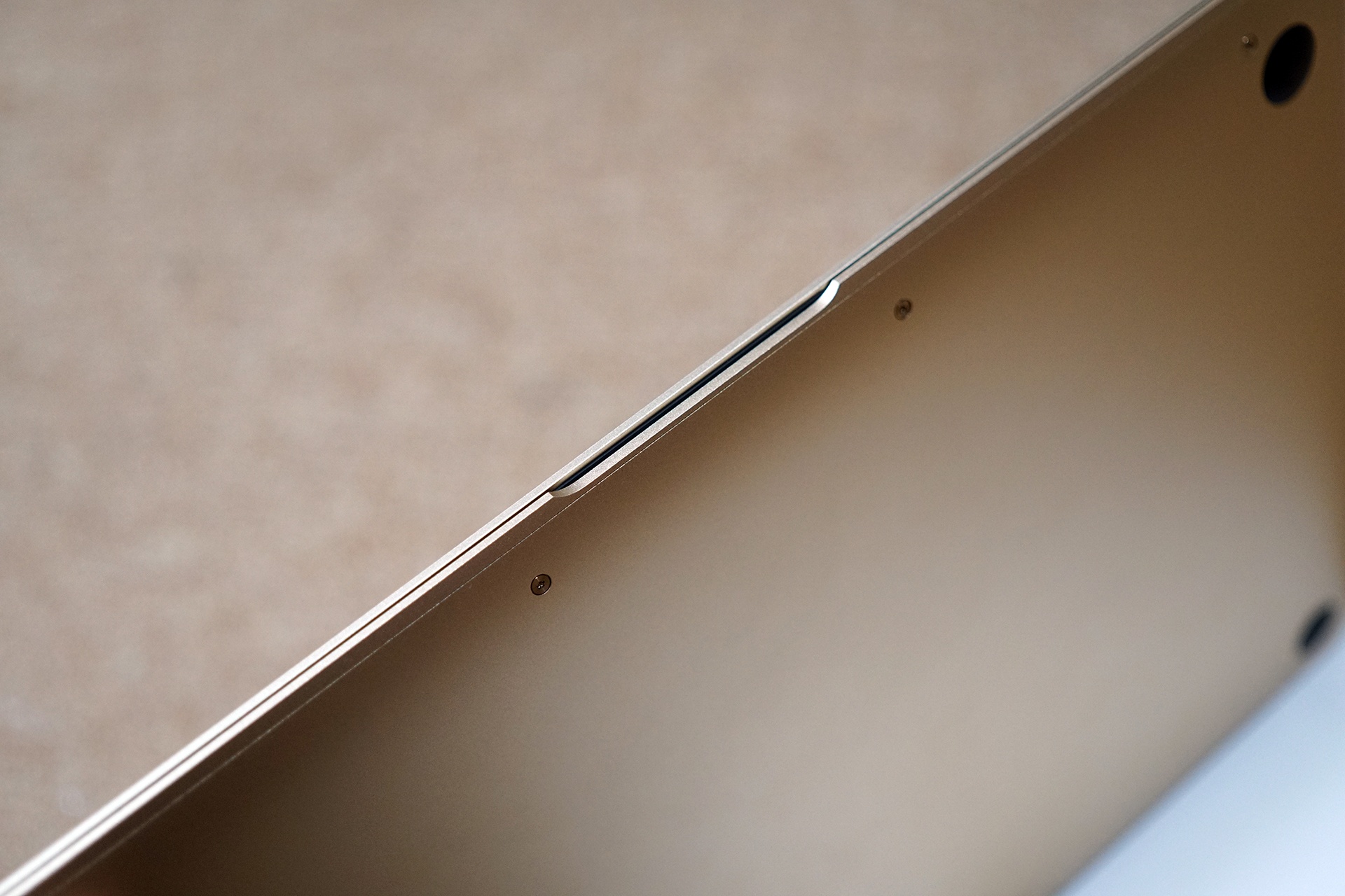 | Chỗ mỏng nhất của MacBook 12 Retina là khe mở nắp máy. Người dùng có thể cảm thấy khá khó khăn khi lần đầu sử dụng vì chi tiết này quá mỏng. Bù lại, Apple làm tốt việc cân bằng lực, để máy trên bàn không phải giữ phần dưới cũng có thể lật màn hình lên được. |
