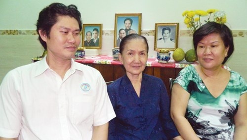 Bà Ngô Thị Kim Thanh, vợ ông Nguyễn Thành Trí, hạm phó chiến hạm Nhật Tảo và hai con bên các kỷ vật. |