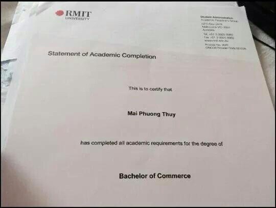 Mai Phương Thúy vừa đăng tải trên trang cá nhân hình ảnh tờ giấy chứng nhận tốt nghiệp ngành Thương mại của trường Đại học Quốc tế RMIT, kèm dòng chia sẻ khá dài, đề cập việc cô muốn chứng minh đã hoàn thành việc học, xóa bỏ mọi nghi vấn học mãi không ra trường.