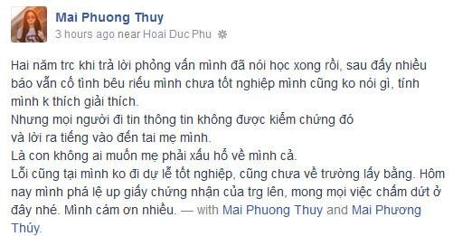Thế nhưng, sau một thời gian dài Nam tiến và bận rộn với các hoạt động nghệ thuât, Mai Phương Thúy ít đề cập đến việc học của mình. Điều này đã khiến nhiều trang tin nghi ngại, hoa hậu đang giấu diếm thông tin chuyện học hành không ''nên đầu nên đũa''. Nhiều đồn đoán cho rằng cô bị cho thôi học và không được phát bằng tốt nghiệp. Việc công khai bằng tốt nghiệp mới đây phần nào đã chứng minh Mai Phương Thúy là một trong những hoa hậu tài sắc vẹn toàn.