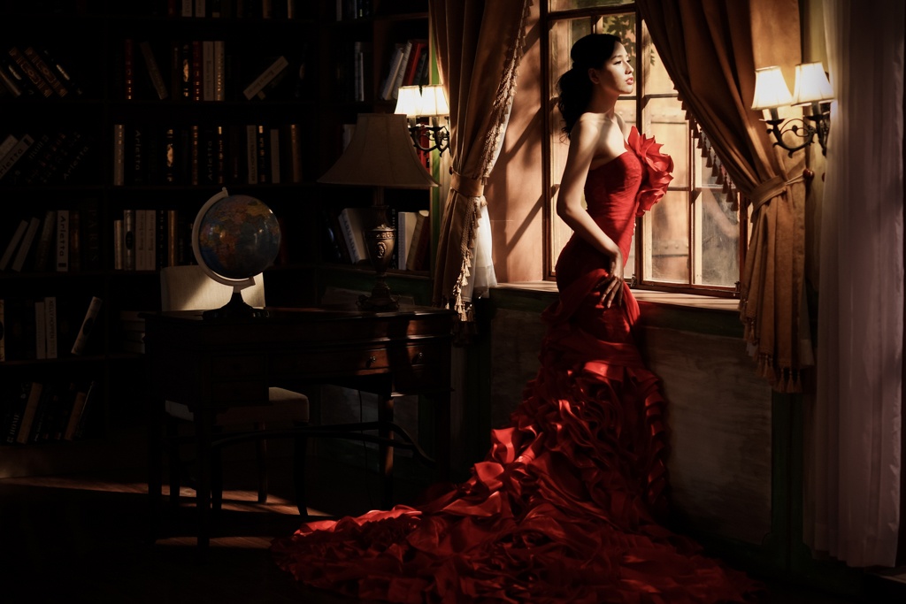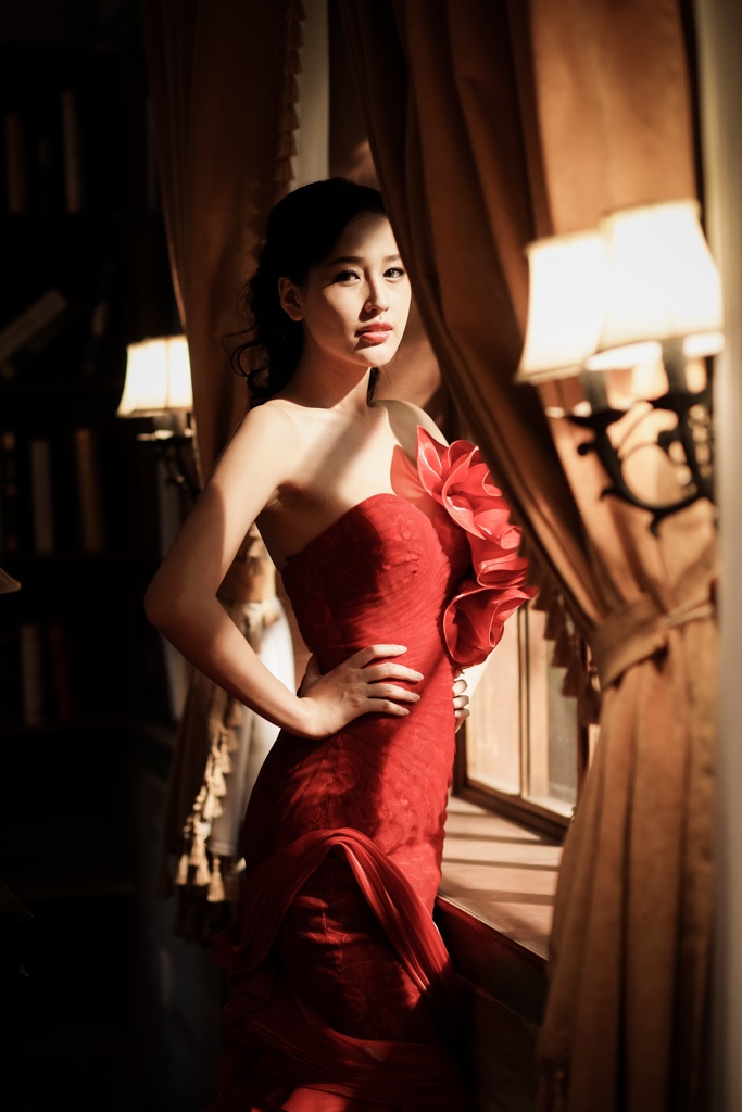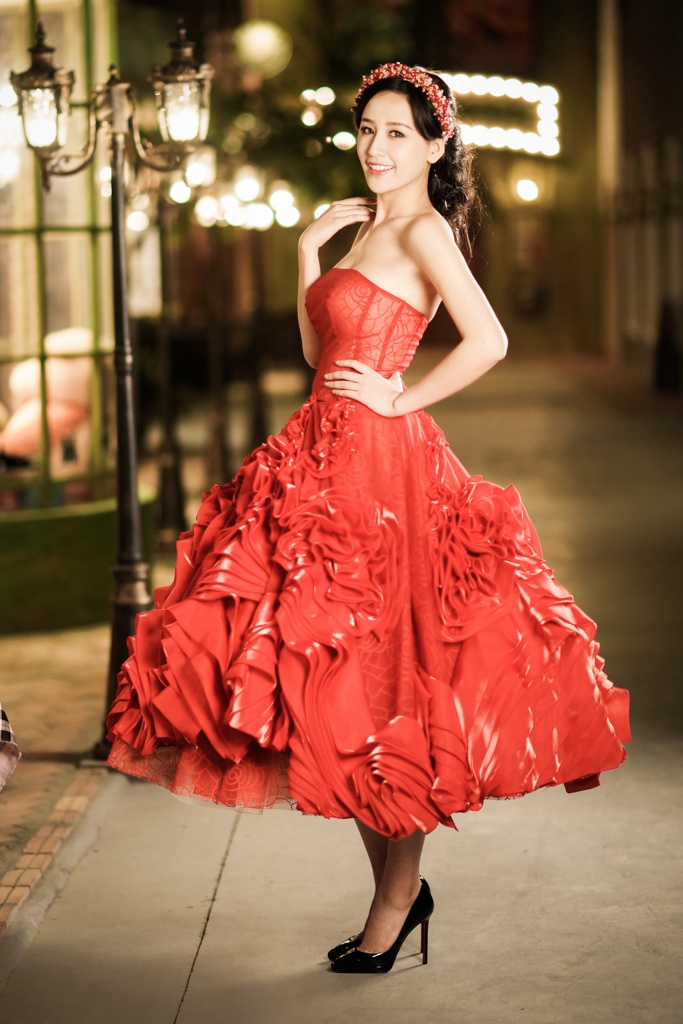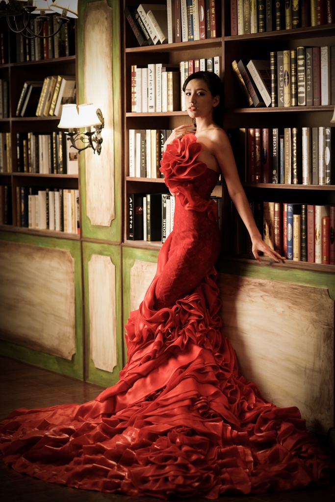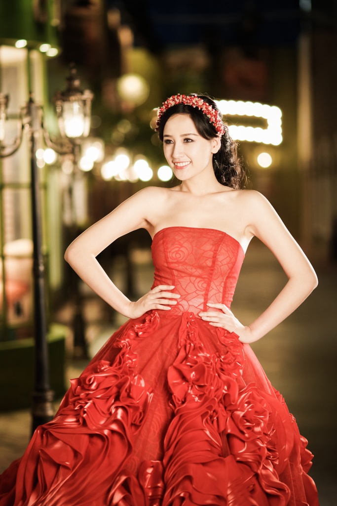 | Trong loạt ảnh mới, người đẹp sinh năm 1988 diện đầm dạ hội và đội vòng nguyệt quế cùng tông màu đỏ. |